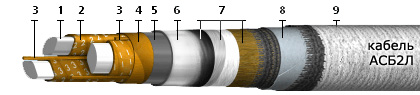 Строение кабеля АСБ2л 3х95(ож)-10: