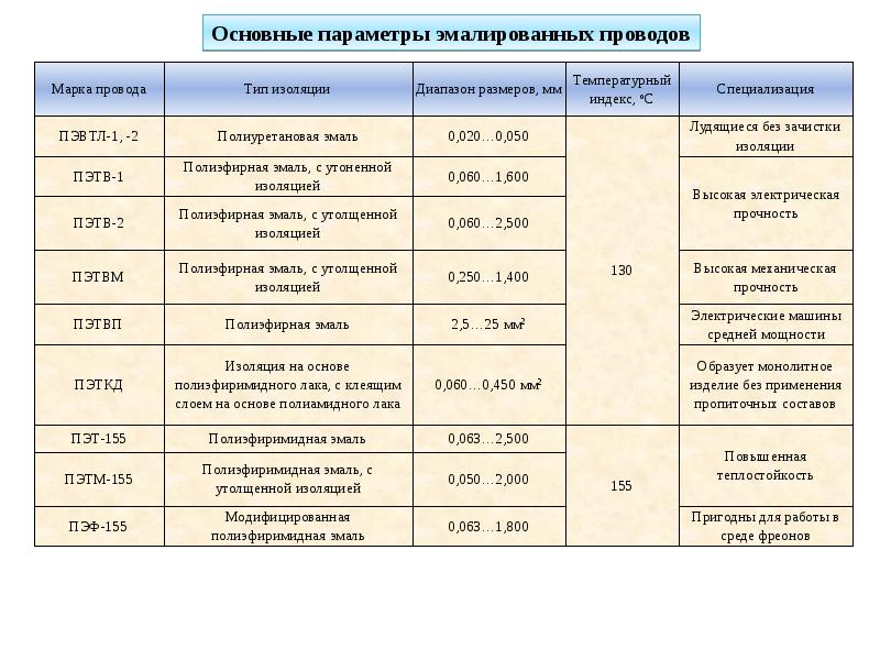 Таблица 1. Сравнение эмалированных проводов по основным параметрам