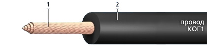 1. Проводник скрученная из медных или медных лужёных проволок (класс 5);2. Изоляционно-шланговая резиновая защитная оболочкатипа РТИШМ на основе натурального и бутадиенового каучуков.