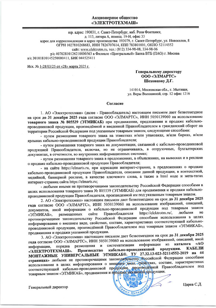 Согласие предоставлено безвозмездно и действует до конца 2025 года. Оно позволяет «ЭЛМАРТС» законно продвигать и продавать продукцию, произведённую АО «Электротехмаш» под брендом «ЭТМИКАБ», в соответствии с законодательством РФ. Для потребителей это означает прозрачность и уверенность в качестве приобретаемой продукции.